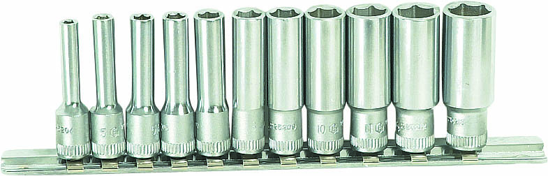 Douilles longues 1/4″ de 4 à 13mm – blister avec rack métallique de 11 pcs