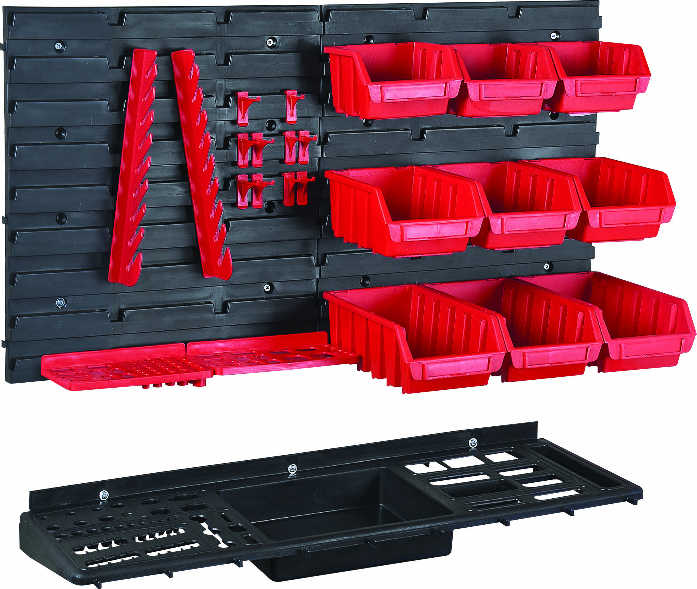Panneau mural solide avec divers accessoires de rangement pour des outils de différentes tailles.